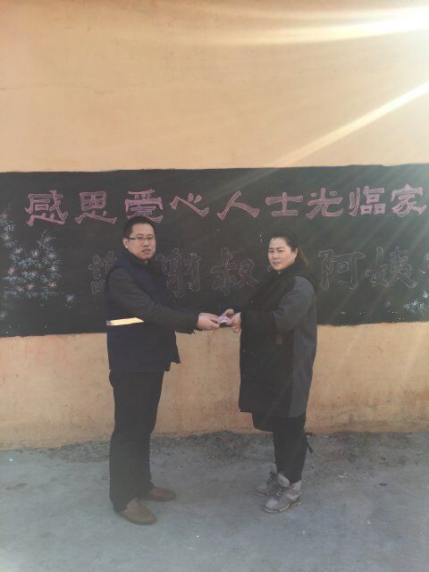 公司領(lǐng)導(dǎo)代表全體員工將愛心款交給孤兒院院長。