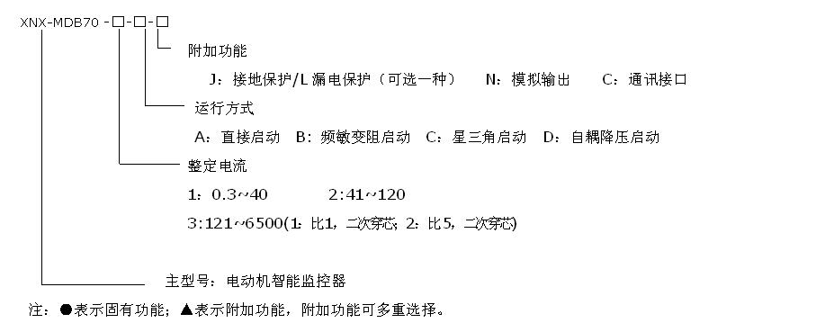 XNX-MDB70系列電動機智能監(jiān)控器是一款智能化、數(shù)字化、網(wǎng)絡(luò)化的控制器。該產(chǎn)品基于微處理器技術(shù),將網(wǎng)絡(luò)通訊技術(shù)和分布式智能技術(shù)溶入MCC控制中心,集電機智能保護、運行狀態(tài)監(jiān)控、故障記錄及網(wǎng)絡(luò)通訊為一體;可以查看測量數(shù)據(jù)、報警信息、故障信息等,并可根據(jù)用戶需要方便的進行保護參數(shù)設(shè)定。能滿足諸多啟動方式,在低壓控制終端MCC柜和1/4單元及以上各種抽屜柜中可直接安裝使用。 二、型號說明
